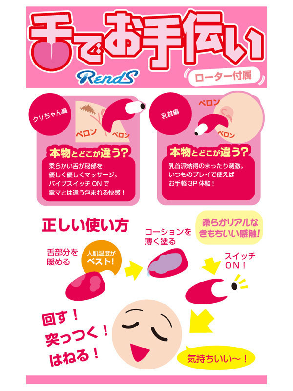一人オナニーでもクンニ気分!オーラルプレイの幅が広がる、頼もしい助っ人ローター「舌でお手伝い」。人体模型を見本にして造型されたこだわりの外観は、色も形もまさに本物!むにゅっとした柔らかめの素材で、乳首やクリをねっとりと刺激します。付属のローターは着脱できるので、装着穴に指をハメても使用可能。自らの舌技と合わせれば、憧れの3Pも夢じゃない!?優しい微振動がもたらす超舌プレイをぜひご堪能ください。ボタン電池(LR44)×3個付属。※ローター内の絶縁体を取り除いてからご使用ください。
