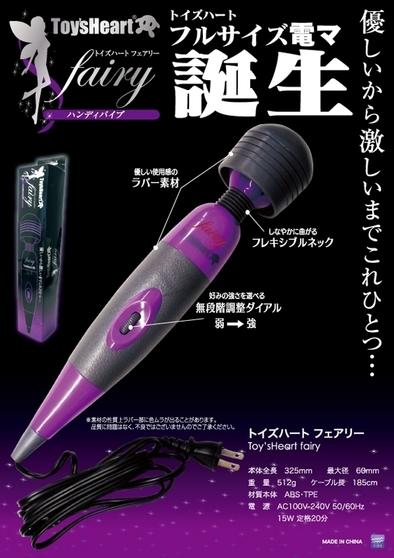 電マで人気のフェアリーが黒×紫に!トイズハートブランドのロゴを冠して登場です。色違いでラグジュアリー感が増したかも?!女性のオナニーやパートナーの責め具として定番の白×ピンクタイプと同じ性能。振動パワーが落ちないAC電源・ダイヤル式無段階調節・しなやかで当てやすいヘッドなど、使用感は折り紙つき!こだわりの詰まった電マです。※ラバー部分に色ムラが出ることがありますが、品質に問題はありません。※素材の性質上、ラバー部に色ムラが出ることがあります。品質に問題はなく、不良ではございませんのでご了承下さい。
