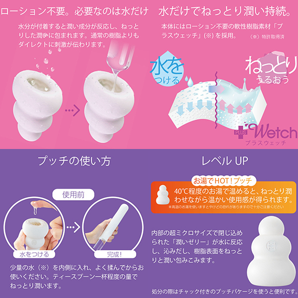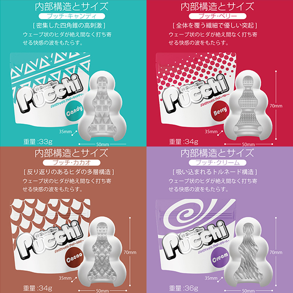 全てが新しくなったプッチ。ポケットサイズのローション不要ホールプッチシリーズが生まれ変わって新登場。軟性素材から内部の構造、パッケージ、全てが新しくなりました。デコボコ感、さらにクッキリ。今回新たに導入した「HD(High Definition)成形」で突起のデコボコ感がさらにクッキリになりました。突起に触れたときの粒立ちが違います。弾力感、さらにモッチリ。「HD 成形」により軟性樹脂の弾力性も向上。さらにモッチモチに、しなやかな素材になりました。内部構造も、さらにハッキリ。オリジナルシリーズ、スイーツシリーズ計8種類の内部構造をより精密な造形にリニューアル。「HD 成形」とあいまってデコボコ感がよりハッキリわかる構造になりました。生産工場を一新。新型プッチシリーズは日本国内に新設した工場から生産。最新の設備と厳密な品質管理で一つ一つ丁寧に作ります。ローション不要、必要なのは水だけ。ローション不要軟性素材「プラスウェッチ」水分が付着すると潤い成分が反応、ねっとりした潤いに包まれます。<キャンディー内部構造>「密集した四角錐の高刺激」整然と敷き詰められた四角錘の突起<クリーム内部構造>「吸い込まれるトルネード構造」斜めに擦り上げてくるヒダはクリームのように昇りつめる絶頂感<ベリー内部構造>「全体を覆う繊細で優しい突起」フワフワとした起毛が包み込みまったりしたなめらかな触感<カカオ内部構造>「反り返りのあるヒダの多層構造」ビッシリ並んだヒダは反発しながら複雑に絡みつく刺激