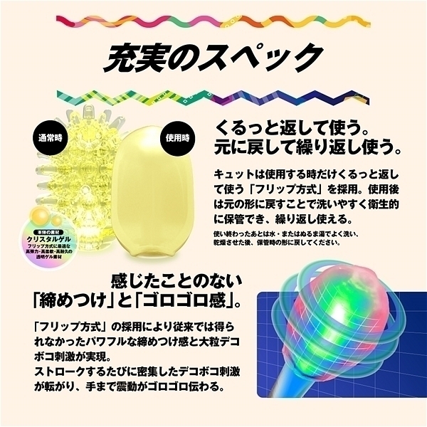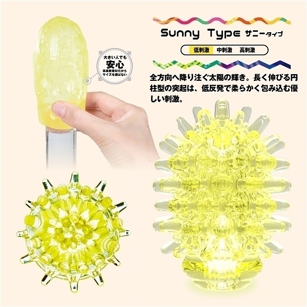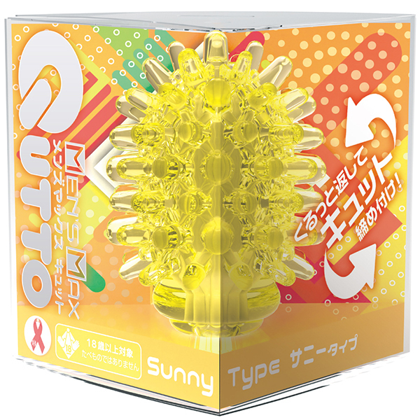 大粒デコボコ刺激がキュット締めつけ!裏返す事で未知なる体験と利便機能を持った変化する密集体ホール。「Qutto−キュット−」は従来よりも突起が大きく、肉厚になった大粒のデコボコ刺激を搭載。使用時に本体の凹凸面を内側に返すことで、内側に向かって大粒のデコボコ刺激が密集。キュット締めつけることで、「未確認の触感」を体験することができます。サニータイプは、全方向へ降り注ぐ太陽の輝き。 長く伸びる円柱型の突起は、低反発で柔らかく包み込む優しい刺激。この商品には個装のローションが付属しています。