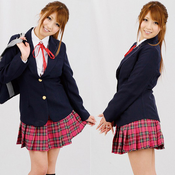 元気いっぱいのキュートな女子校生に変身!シンプルな二つボタンのブレザーに、チェック柄スカートをあわせた制服コスチューム。リボン付きブラウス、ブレザー、スカート、さらにハイソックスまでセットになった充実の制服コスプレです。※サイズはおおよその目安となります。表記のサイズを基準に前後でお考え下さい。