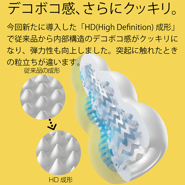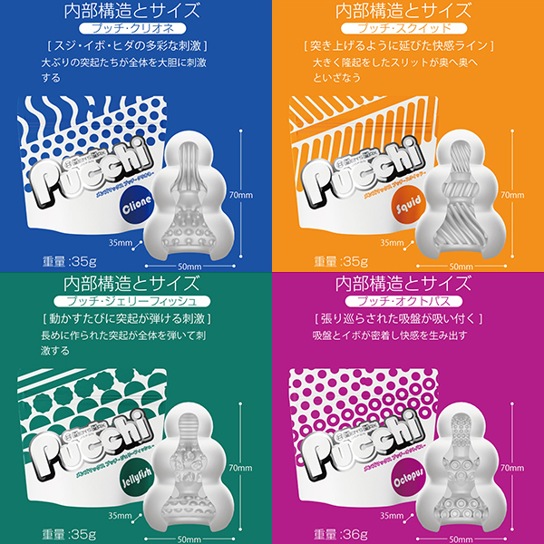 全てが新しくなったプッチ。ポケットサイズのローション不要ホールプッチシリーズが生まれ変わって新登場。軟性素材から内部の構造、パッケージ、全てが新しくなりました。デコボコ感、さらにクッキリ。今回新たに導入した「HD(High Definition)成形」で突起のデコボコ感がさらにクッキリになりました。突起に触れたときの粒立ちが違います。弾力感、さらにモッチリ。「HD 成形」により軟性樹脂の弾力性も向上。さらにモッチモチに、しなやかな素材になりました。内部構造も、さらにハッキリ。オリジナルシリーズ、スイーツシリーズ計8種類の内部構造をより精密な造形にリニューアル。「HD 成形」とあいまってデコボコ感がよりハッキリわかる構造になりました。生産工場を一新。新型プッチシリーズは日本国内に新設した工場から生産。最新の設備と厳密な品質管理で一つ一つ丁寧に作ります。ローション不要、必要なのは水だけ。ローション不要軟性素材「プラスウェッチ」水分が付着すると潤い成分が反応、ねっとりした潤いに包まれます。<クリオネ内部構造>「スジ・イボ・ヒダの多彩な刺激」大ぶりの突起たちが全体を大胆に刺激する<ジェリーフィッシュ内部構造>「動かすたびに突起が弾ける刺激」長めに作られた突起が全体を弾いて刺激する<オクトパス内部構造>「張り巡らされた吸盤が吸い付く」吸盤とイボが密着し快感を生み出す<スクイッド内部構造>「突き上げるように延びた快感ライン」大きく隆起をしたスリットが奥へ奥へといざなう
