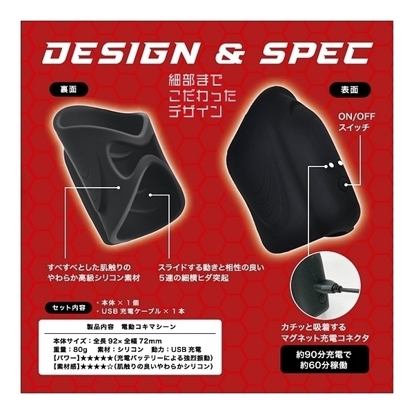 激コキ!衝撃快感が貴男を襲う!振動×シゴキによる、驚異の振動オナホールが新登場!いつもの手コキが、激烈快感のシェイクに大変身!!振動電源ONすれば、痺れるようなメガバイブレーション!さらに楽しめる振動アクションは、全10パターン!その激烈振動のハイパワーを実現させる、USB充電式バッテリー!本体内部の突起は、スライドするのにぴったりな5つの波形突起!すべすべとした肌触りの、やわらか高級シリコン素材!カチっと吸着する、マグネット充電コネクタ!約90分充電で、約60分稼働が可能!「スライド」は、上下にストロークする筒状モデル。いつもの手コキをバージョンアップする、ハンド拡張のような電動コキマシーン!バイブレーションを楽しみながらシェイクにスライドすれば、想像を超える夢の手コキ体験となるはず!