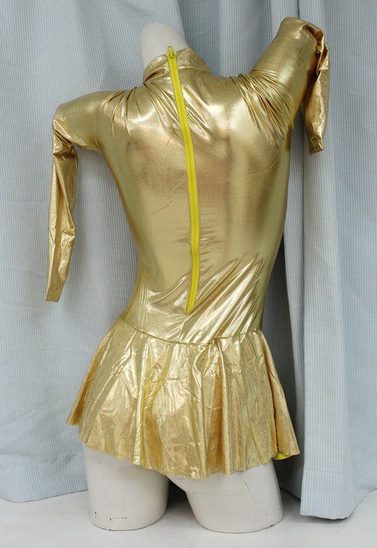 まるでフィギュアスケーターのような、スカート付きの長袖レオタード(BIG)。エナメル製のように光沢のある、キラリと輝くゴージャスなゴールドカラー!伸縮性があるので、ピッチリとしたバストやクビレが美しいボディラインを引き立てます!ひらりと軽いスカートから覗く、ハイレグとヒップラインがとってもセクシーなコスチューム!背中のファスナーで脱着衣が可能です。※水洗い可、塩素系漂白剤による漂白不可、ドライクリーニング可、色落ちの可能性があります。※こちらの商品は在庫の状況によりお届けまでに4日〜7日程度かかる場合がございます。