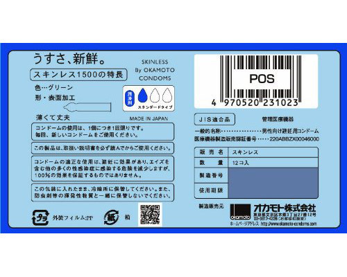 もっとナチュラルな装着感を!ユーザーの熱い声に応え、大手メーカー「オカモト」社が作り上げた、薄くてやわらかな質感が特徴的なコンドーム(12個入り)。スキン(皮膜)+レス(〜のない)の名の通り、スキンがあることを感じさせない薄さでパートナーの温もりや感触もリアルに感じられ、プレイが燃え上がること間違いなし!表裏のわかりやすい加工も嬉しい、爽やかなグリーンのコンドームです。