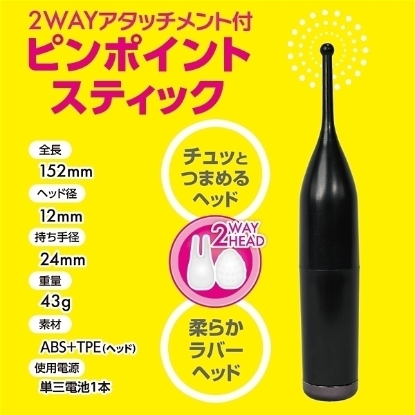 ピンポイントを徹底刺激するスティックローター登場。先端シリコンヘッドが丁度良い部分を絶妙振動で刺激します。シリコンヘッドはポイントヘッドとチュッとつまめる二又ヘッドの2WAY使用が可能です。軽量ボディだから使用感もバツグン!とにかくお手軽で使いやすいスティックローター。●カラー:ブラック