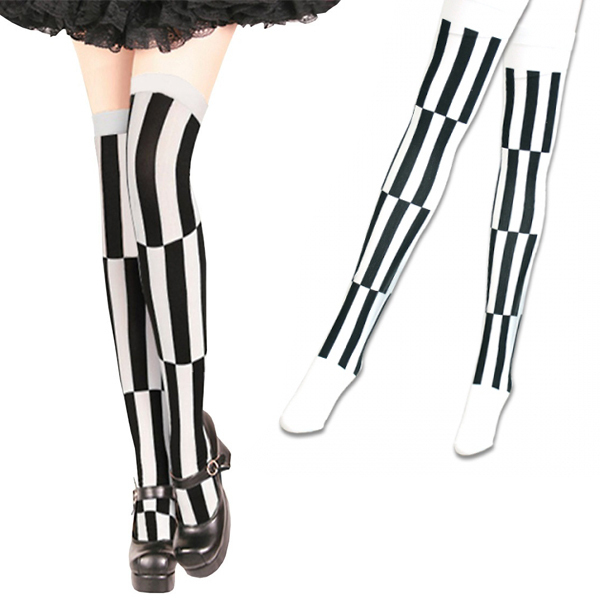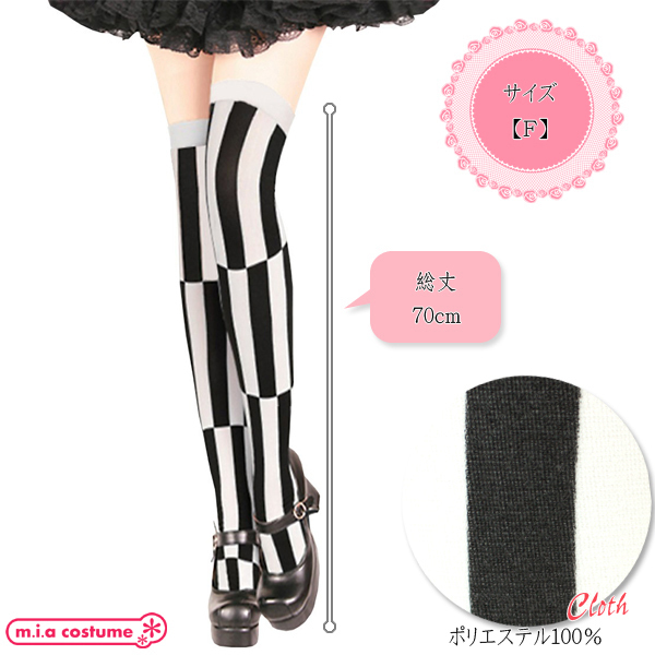 ゴシック&ロリータファッションと相性抜群!ブロック模様の白黒ストライプ柄ニーハイストッキング70cm。個性的でお洒落なデザインで足元を可愛くコーディネートしよう♪コスプレやハロウィン仮装と合わせても◎※色落ちの可能性があるため、塩素系漂白剤での漂白&水洗い不可。※水洗い不可、塩素系漂白剤による漂白不可、色落ちの可能性があります。※こちらの商品は在庫の状況によりお届けまでに4日〜7日程度かかる場合がございます。